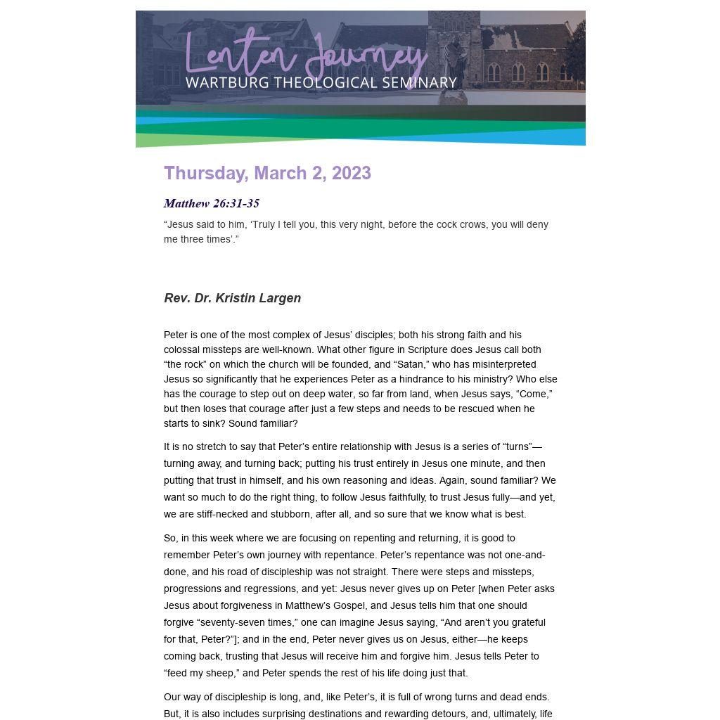 Our way of discipleship is long, and, like Peter’s, it is full of wrong turns and dead ends. But, it is also includes surprising destinations and rewarding detours, and, ultimately, life abundant and life eternal with Jesus Christ.