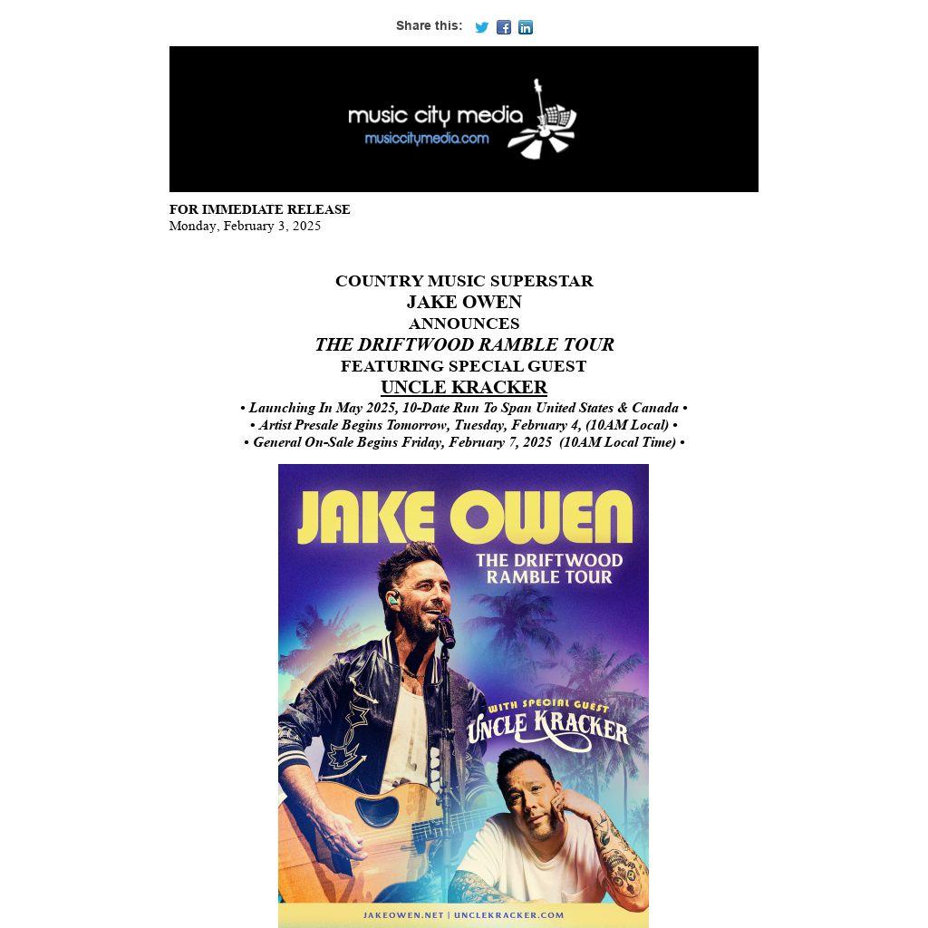 NASHVILLE, Tenn.– Country music superstar Jake Owen introduced the launch of The Driftwood Ramble Tour (with special guest Uncle Kracker) in May 2025.