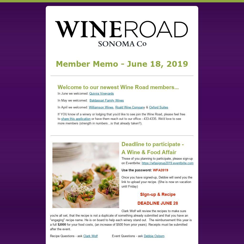 Clark Wolf will review the recipes to make sure you're all set, that the recipe is not a duplicate of something already submitted and that you have an "engaging" recipe name. He is on board to help each winery stand out. The reimbursement this year is a full $2000 for your food costs, (an increase of $500 from prior years). Receipts must be submitted after the event.