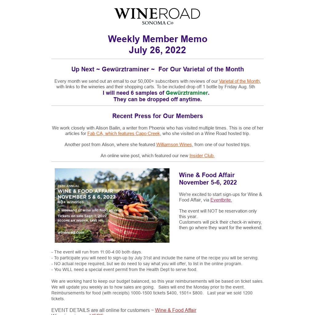 In the Members section of WineRoad.com, click on Annual Events and we have a broad brush format for all three of our annual events going forward - dates, deadlines, ticket prices etc. Also, all of our consumer facing pages are now updated for all three events, heading into 2023.