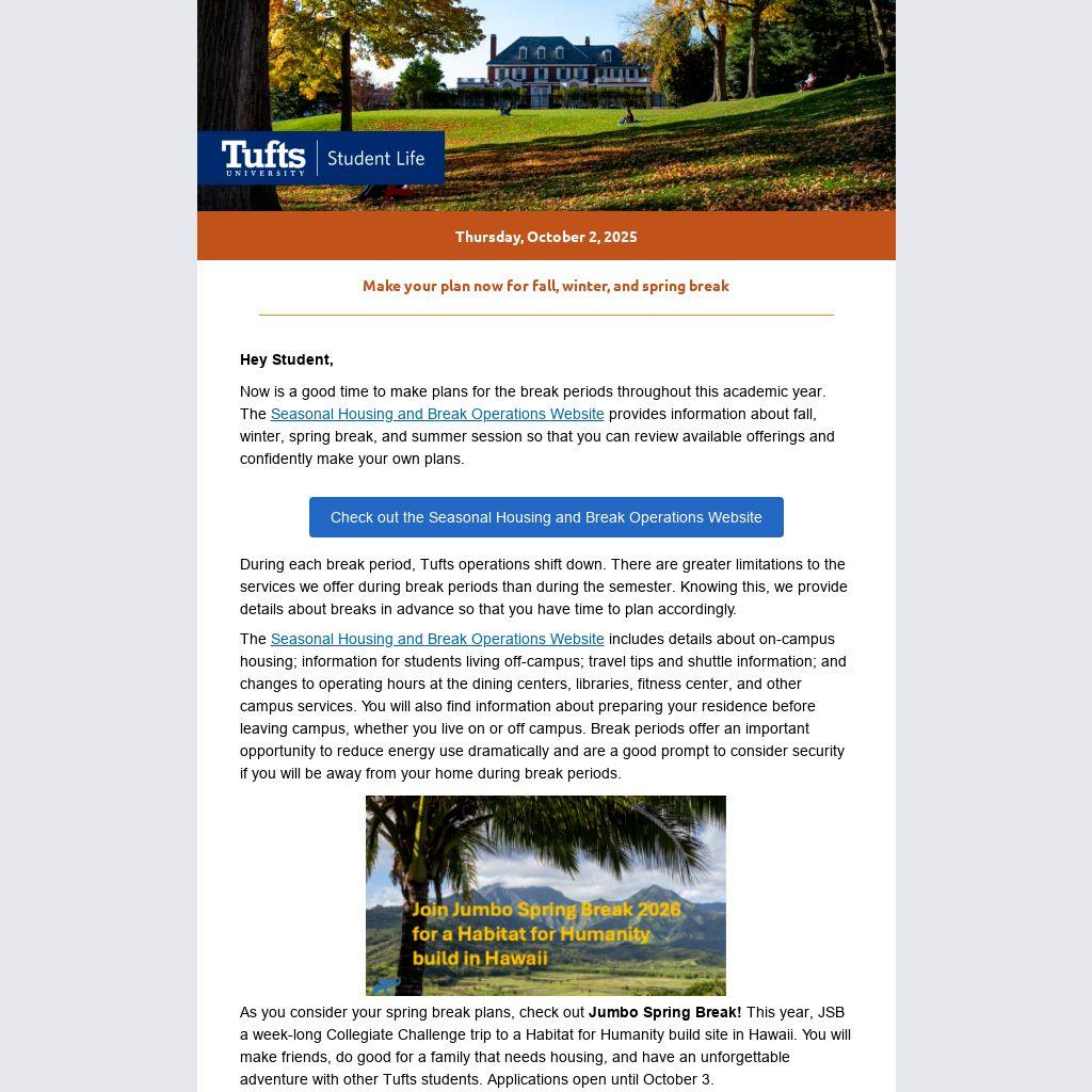 As you consider your spring break plans, check out Jumbo Spring Break! This year, JSB a week-long Collegiate Challenge trip to a Habitat for Humanity build site in Hawaii. You will make friends, do good for a family that needs housing, and have an unforgettable adventure with other Tufts students. Applications open until October 3.