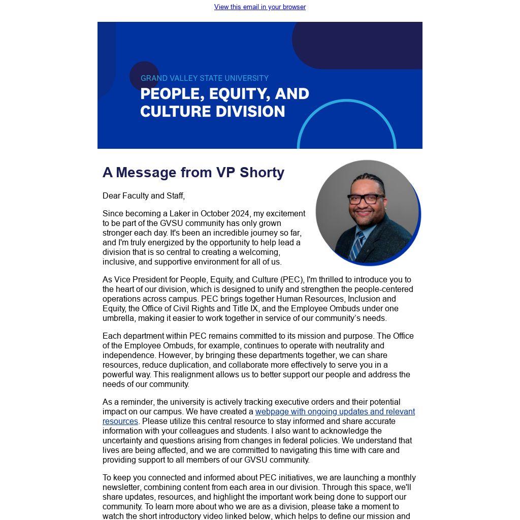 I’m honored to be leading PEC, and I look forward to the work we will continue to do together in making GVSU a place where everyone feels supported, valued, and heard.
