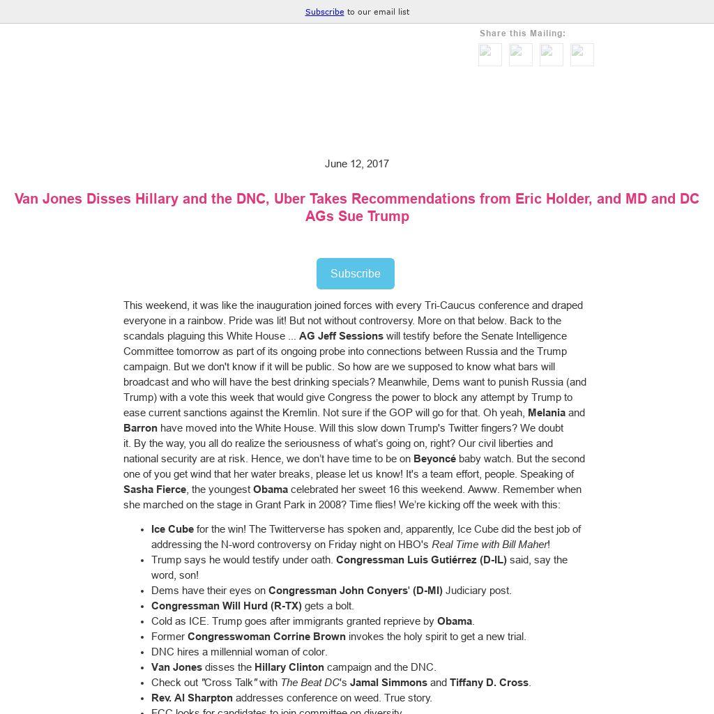 This weekend, it was like the inauguration joined forces with every Tri-Caucus conference and draped everyone in a rainbow. Pride was lit! But not without controversy. More on that below. Back to the scandals plaguing this White House ... AG Jeff Sessions will testify before the Senate Intelligence Committee tomorrow as part of its ongoing probe into connections between Russia and the Trump campaign. But we don't know if it will be public. So how are we supposed to know what bars will broadcast and who will have the best drinking specials? Meanwhile, Dems want to punish Russia (and Trump) with a vote this week that would give Congress the power to block any attempt by Trump to ease current sanctions against the Kremlin. Not sure if the GOP will go for that. Oh yeah, Melania and Barron have moved into the White House. Will this slow down Trump's Twitter fingers? We doubt it. By the way, you all do realize the seriousness of what’s going on, right? Our civil liberties and national security are at risk. Hence, we don’t have time to be on Beyoncé baby watch. But the second one of you get wind that her water breaks, please let us know! It's a team effort, people. Speaking of Sasha Fierce, the youngest Obama celebrated her sweet 16 this weekend. Awww. Remember when she marched on the stage in Grant Park in 2008? Time flies! We’re kicking off the week with this:- Ice Cube for the win! The Twitterverse has spoken and, apparently, Ice Cube did the best job of addressing the N-word controversy on Friday night on HBO's Real Time with Bill Maher!