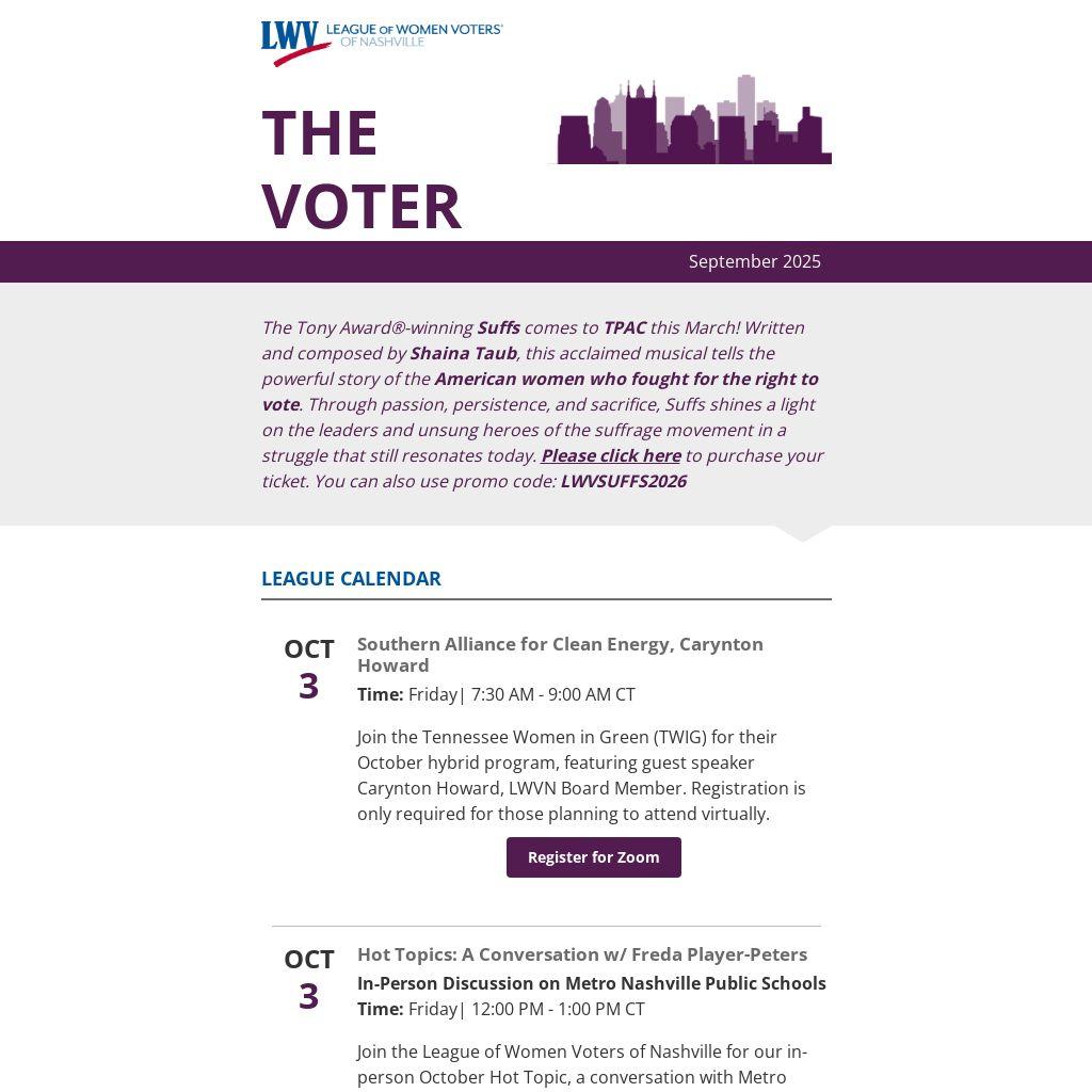 The Tony Award®-winning Suffs comes to TPAC this March! Written and composed by Shaina Taub, this acclaimed musical tells the powerful story of the American women who fought for the right to vote. Through passion, persistence, and sacrifice, Suffs shines a light on the leaders and unsung heroes of the suffrage movement in a struggle that still resonates today. Please click here to purchase your ticket. You can also use promo code: LWVSUFFS2026