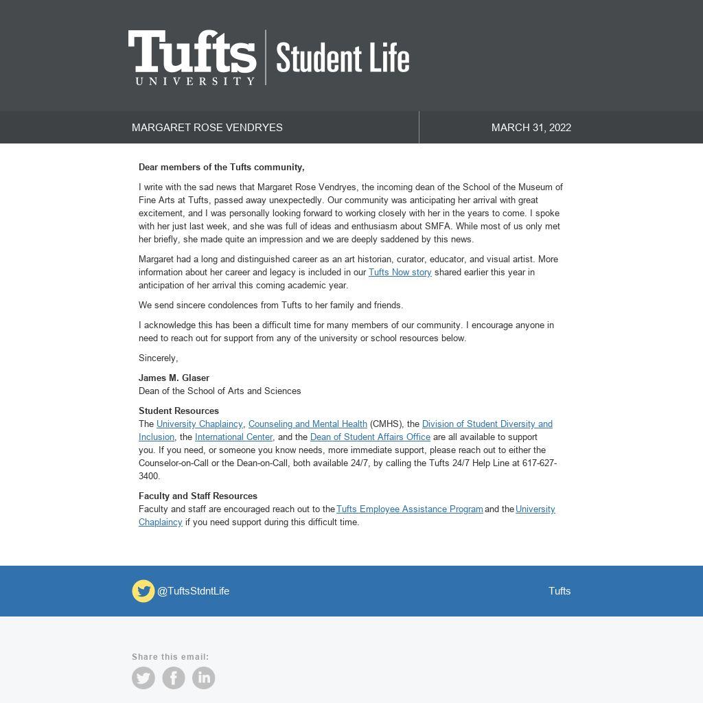 I write with the sad news that Margaret Rose Vendryes, the incoming dean of the School of the Museum of Fine Arts at Tufts, passed away unexpectedly. Our community was anticipating her arrival with great excitement, and I was personally looking forward to working closely with her in the years to come. I spoke with her just last week, and she was full of ideas and enthusiasm about SMFA. While most of us only met her briefly, she made quite an impression and we are deeply saddened by this news.