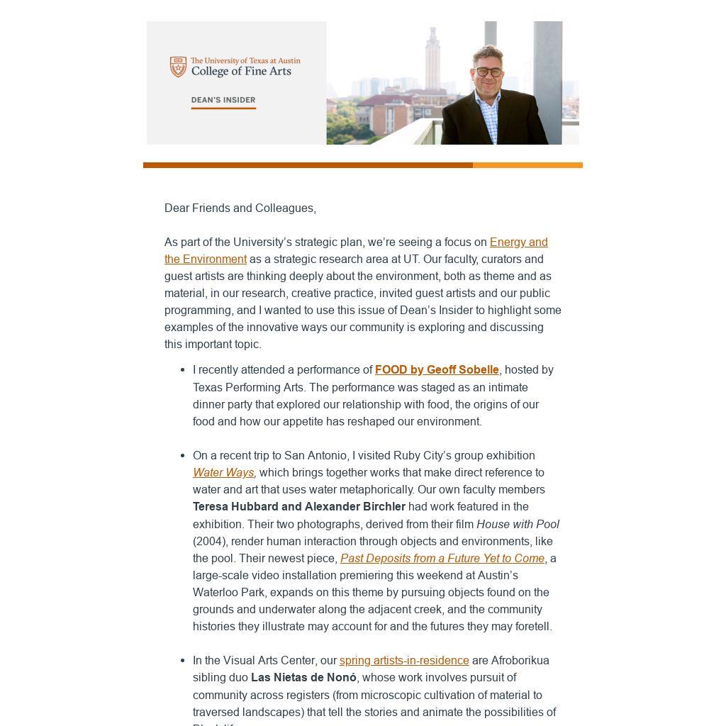 Energy and the Environment as a strategic research area at UT. Our faculty, curators and guest artists are thinking deeply about the environment, both as theme and as material, in our research, creative practice, invited guest artists and our public programming, and I wanted to use this issue of Dean’s Insider to highlight some examples of the innovative ways our community is exploring and discussing this important topic.