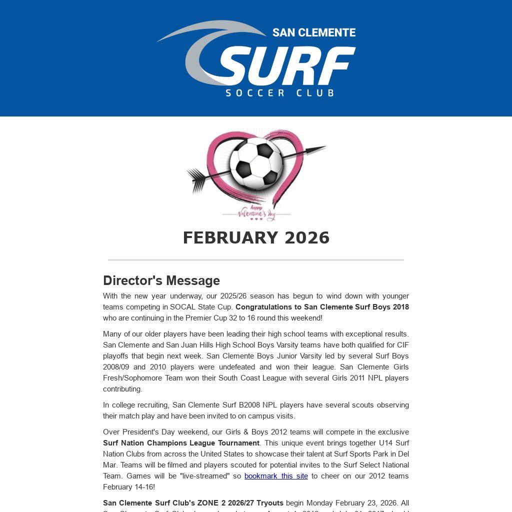San Clemente Surf Club's ZONE 2 2026/27 Tryouts begin Monday February 23, 2026. All San Clemente Surf Club players born between August 1, 2012 and July 31, 2017 should register now. With the recent age group changes and local excitement for World Cup, we anticipate a large turnout.