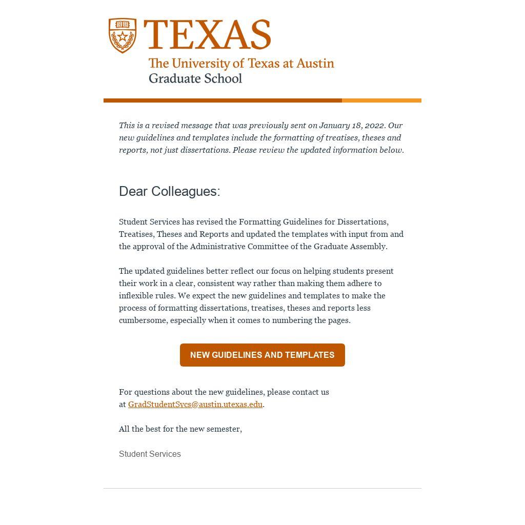 Student Services has revised the Formatting Guidelines for Dissertations, Treatises, Theses and Reports and updated the templates with input from and the approval of the Administrative Committee of the Graduate Assembly.