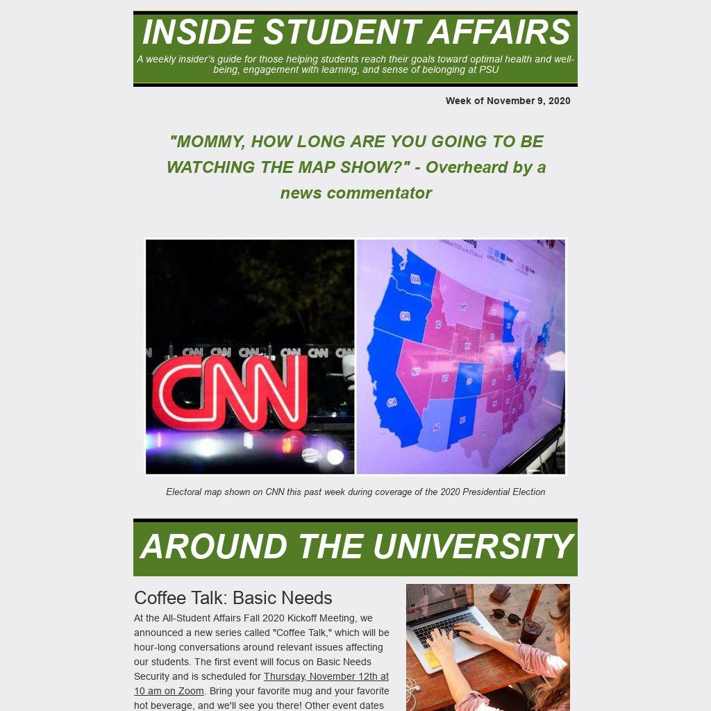 At the All-Student Affairs Fall 2020 Kickoff Meeting, we announced a new series called "Coffee Talk," which will be hour-long conversations around relevant issues affecting our students. The first event will focus on Basic Needs Security and is scheduled for Thursday, November 12th at 10 am on Zoom. Bring your favorite mug and your favorite hot beverage, and we'll see you there! Other event dates will be announced in future editions of Inside Student Affairs.