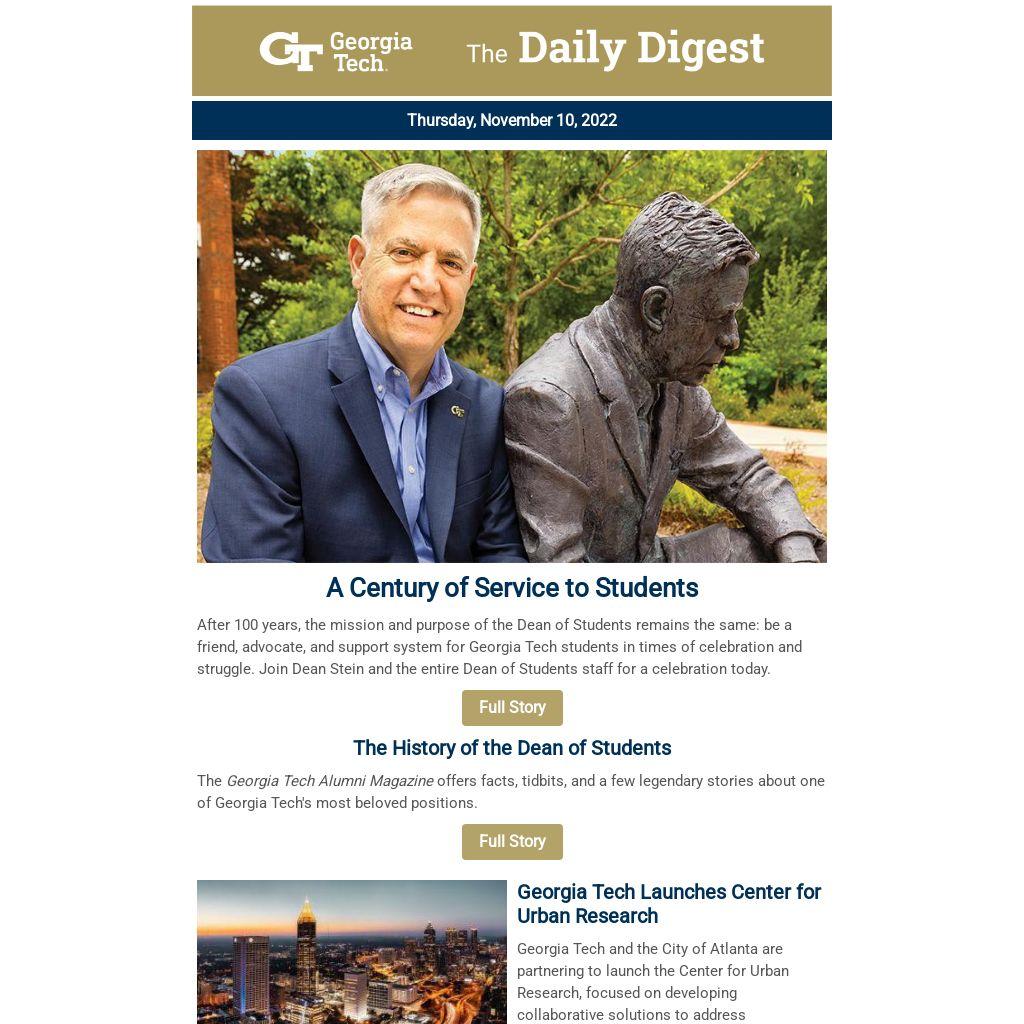 After 100 years, the mission and purpose of the Dean of Students remains the same: be a friend, advocate, and support system for Georgia Tech students in times of celebration and struggle. Join Dean Stein and the entire Dean of Students staff for a celebration today.