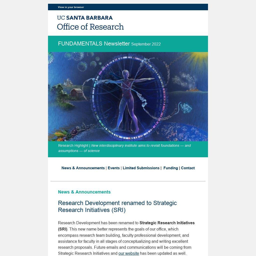 The Strategic Research Intiatives unit of the Office of Research at the UC Santa Barbara publishes the Fundamentals Newsletter. Click here to get in touch with Strategic Research Intiatives staff regarding your proposal development needs.