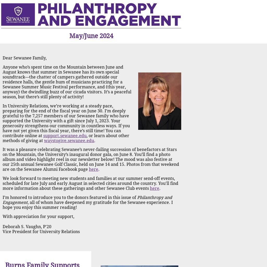 In University Relations, we’re working at a steady pace, preparing for the end of the fiscal year on June 30. I’m deeply grateful to the 7,257 members of our Sewanee family who have supported the University with a gift since July 1, 2023. Your generosity strengthens our community in countless ways. If you have not yet given this fiscal year, there’s still time! You can contribute online at support.sewanee.edu, or learn about other methods of giving at waystogive.sewanee.edu.