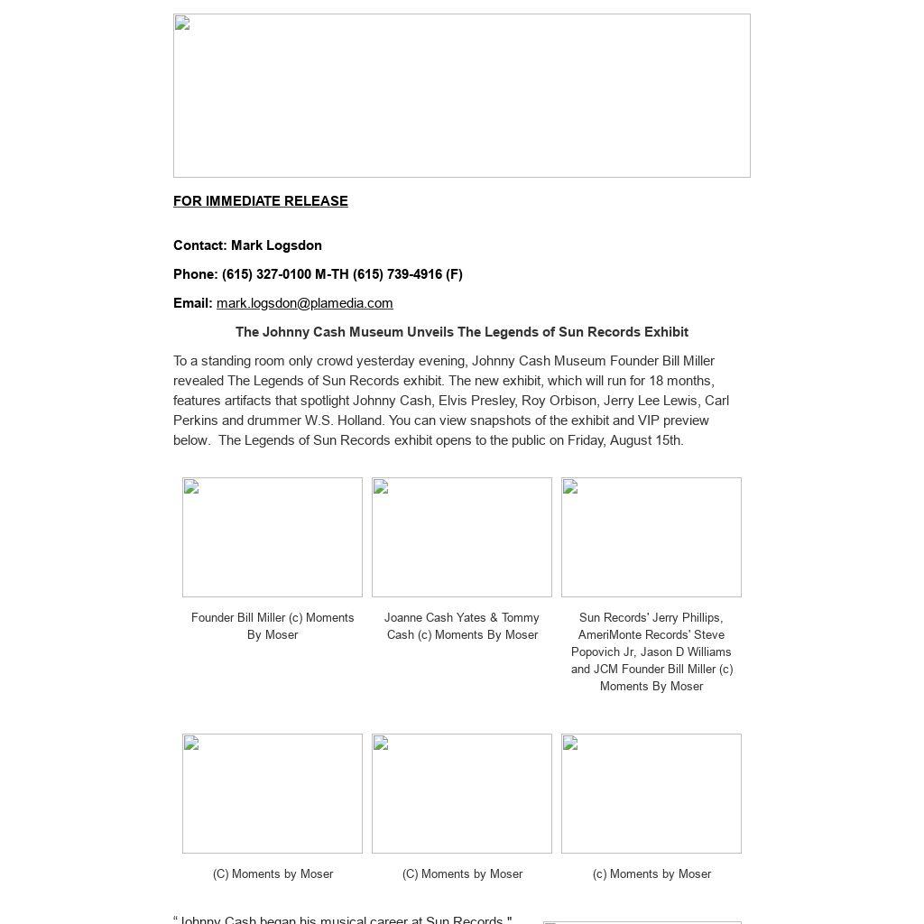 FOR IMMEDIATE RELEASE Contact: Mark Logsdon Phone: (615) 327-0100 M-TH (615) 739-4916 (F) The Johnny Cash Museum Unveils The Legends of Sun Records Exhibit To a standing room only crowd yesterday evening, Johnny Cash Museum Founder Bill Miller revealed The Legends of Sun Records exhibit. The new exhibit, which will run for 18 months, features artifacts that spotlight Johnny Cash, Elvis Presley, Roy Orbison, Jerry Lee Lewis, Carl Perkins and drummer W.S. Holland. You can view snapshots of the exhibit and VIP preview below. The Legends of Sun Records exhibit opens to the public on Friday, August 15th.