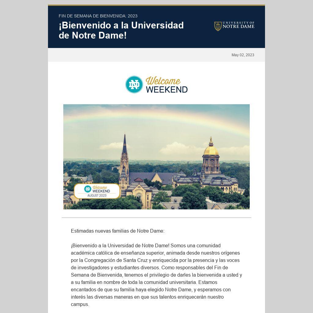 ¡Bienvenido a la Universidad de Notre Dame! Somos una comunidad académica católica de enseñanza superior, animada desde nuestros orígenes por la Congregación de Santa Cruz y enriquecida por la presencia y las voces de investigadores y estudiantes diversos. Como responsables del Fin de Semana de Bienvenida, tenemos el privilegio de darles la bienvenida a usted y a su familia en nombre de toda la comunidad universitaria. Estamos encantados de que su familia haya elegido Notre Dame, y esperamos con interés las diversas maneras en que sus talentos enriquecerán nuestro campus.