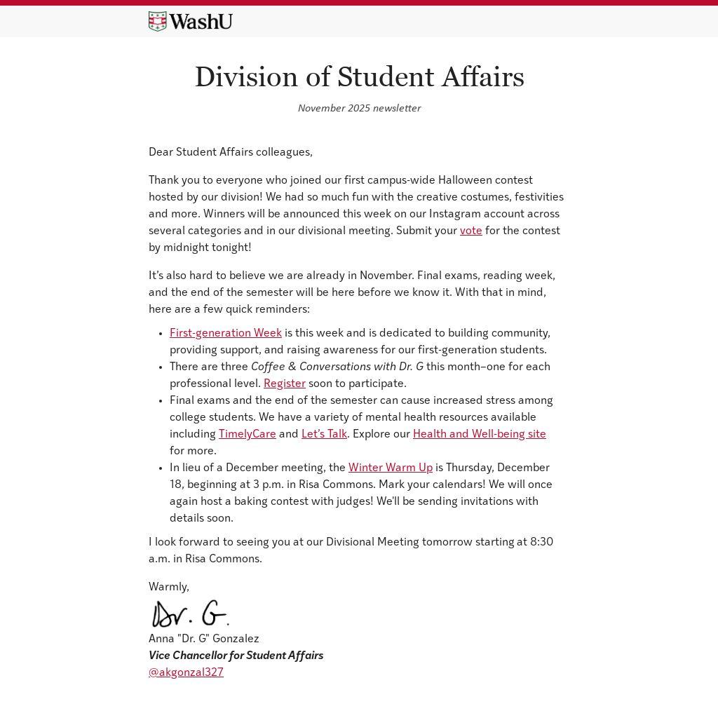 The Student Affairs newsletter is sent the first Tuesday of each month. If your department has content you would like featured, submit via the link below at least a week prior to the edition you would like to be included in.
