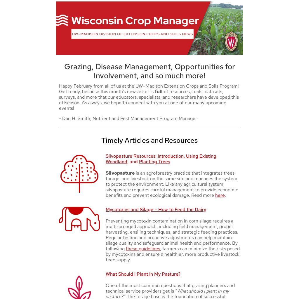 Happy February from all of us at the UW–Madison Extension Crops and Soils Program! Get ready, because this month's newsletter is full of resources, tools, datasets, surveys, and more that our educators, specialists, and researchers have developed this offseason. As always, we hope to connect with you at one of our many upcoming events!