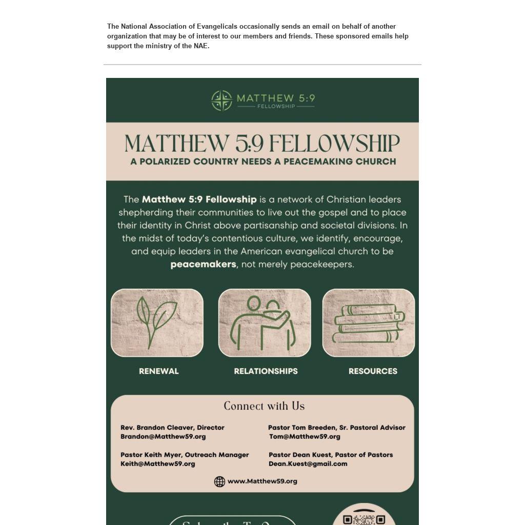 This sponsored email helps support the ministry of the National Association of Evangelicals. It does not imply endorsement from the NAE. If you prefer not to receive sponsored emails, please reply to this email and type UNSUBSCRIBE in the body of the email.