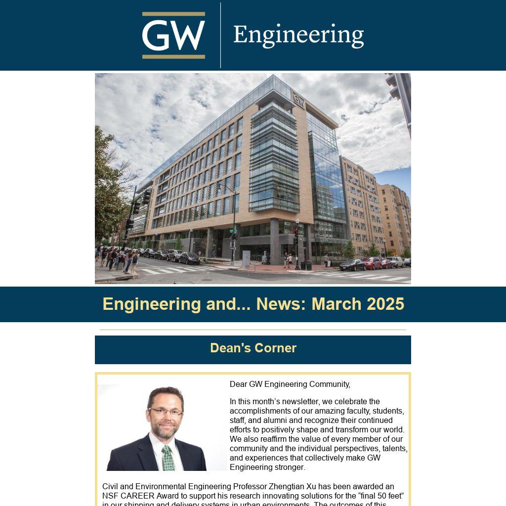 In this month’s newsletter, we celebrate the accomplishments of our amazing faculty, students, staff, and alumni and recognize their continued efforts to positively shape and transform our world. We also reaffirm the value of every member of our community and the individual perspectives, talents, and experiences that collectively make GW Engineering stronger.