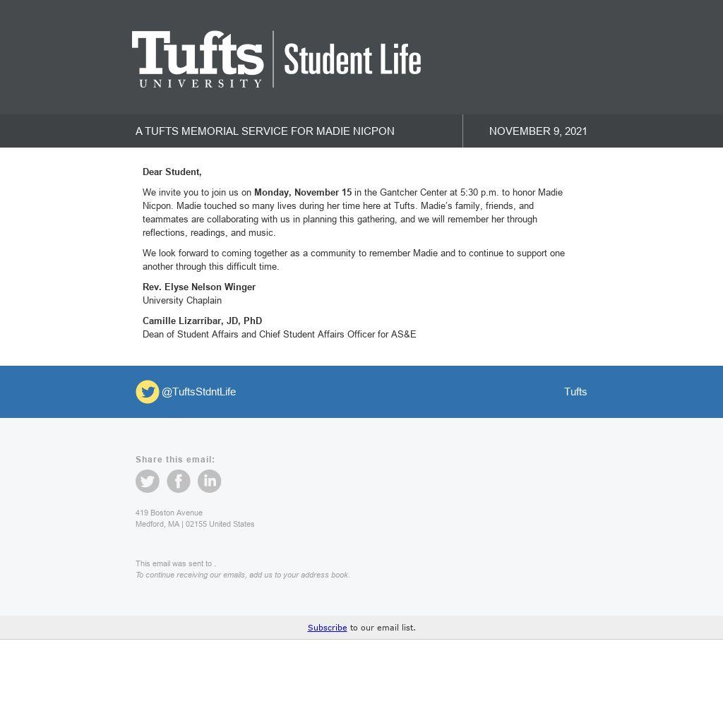 We invite you to join us on Monday, November 15 in the Gantcher Center at 5:30 p.m. to honor Madie Nicpon. Madie touched so many lives during her time here at Tufts. Madie’s family, friends, and teammates are collaborating with us in planning this gathering, and we will remember her through reflections, readings, and music.