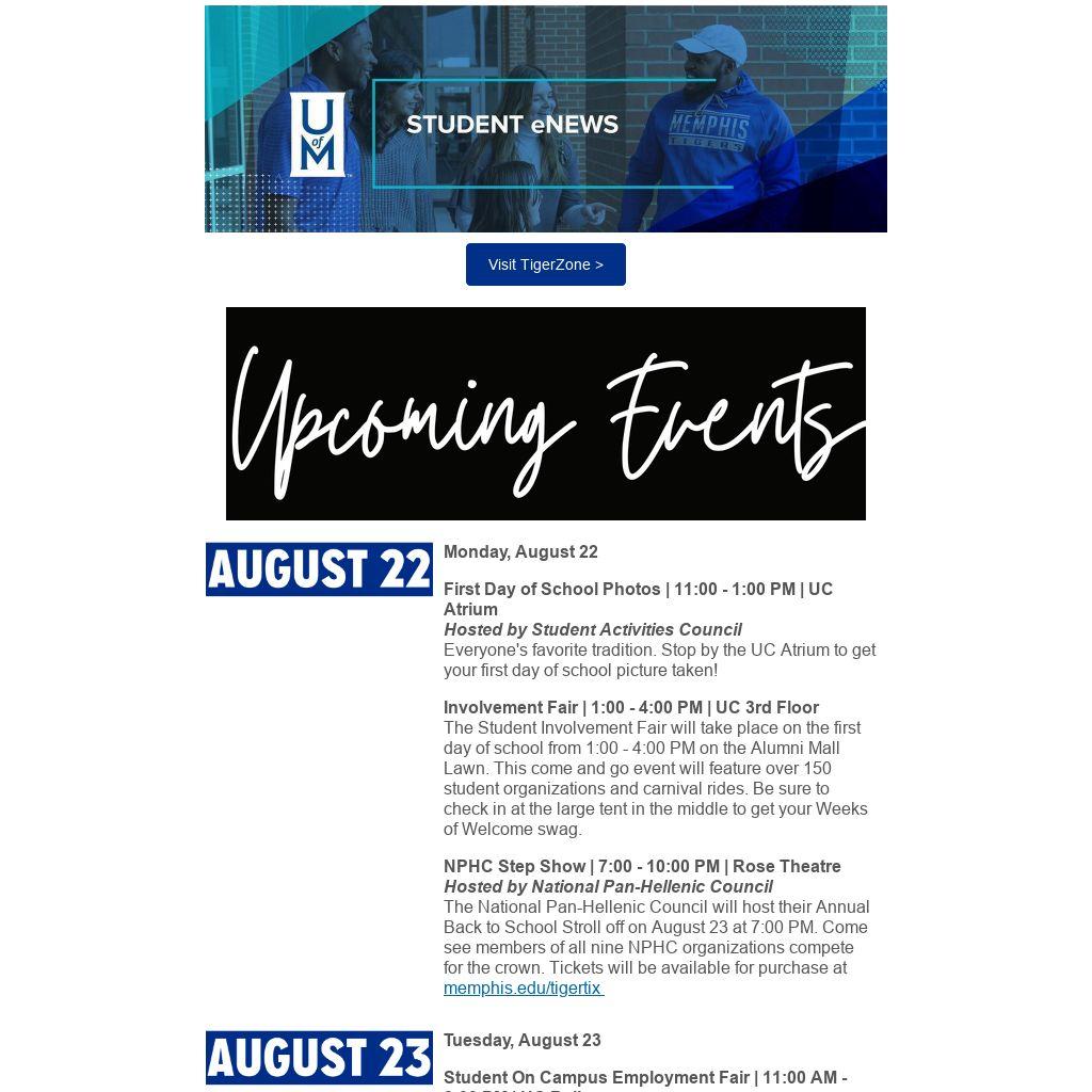 Tiger Blood Drive | 9:00 AM - 3:00 PM | UC Theatre Hosted by Dean of Students Save lives, give blood. All Tigers who are able are encouraged to come to the inaugural Weeks of Welcome blood drive. To make an appointment please go to donors.vitalant.org and use sponsor code UMemphis or contact Melissa Morgan at mamorgn3@memphis.edu. Donors will receive a snack and swag after giving blood.
