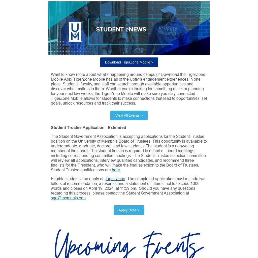 Want to know more about what's happening around campus? Download the TigerZone Mobile App! TigerZone Mobile has all of the UofM's engagement experiences in one place. Students, faculty, and staff can search through available opportunities and discover what matters to them. Whether you're looking for something quick or planning for your next few weeks, the TigerZone Mobile will make sure you stay connected. TigerZone Mobile allows for students to make connections that lead to opportunities, set goals, unlock resources and track their success.