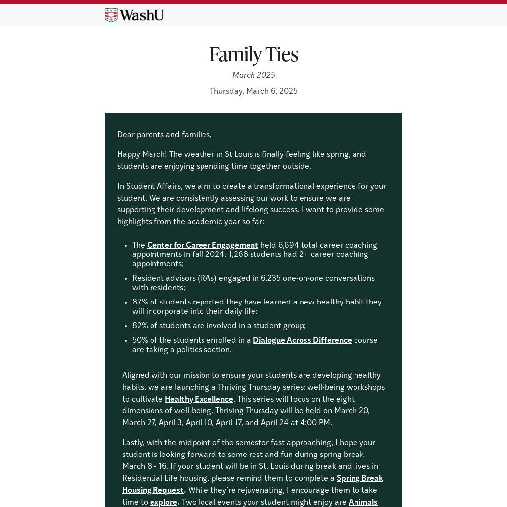 Lastly, with the midpoint of the semester fast approaching, I hope your student is looking forward to some rest and fun during spring break March 8 - 16. If your student will be in St. Louis during break and lives in Residential Life housing, please remind them to complete a Spring Break Housing Request. While they’re rejuvenating, I encourage them to take time to explore. Two local events your student might enjoy are Animals Aglow at the Saint Louis Zoo and the St. Patrick’s Day Parade Run.