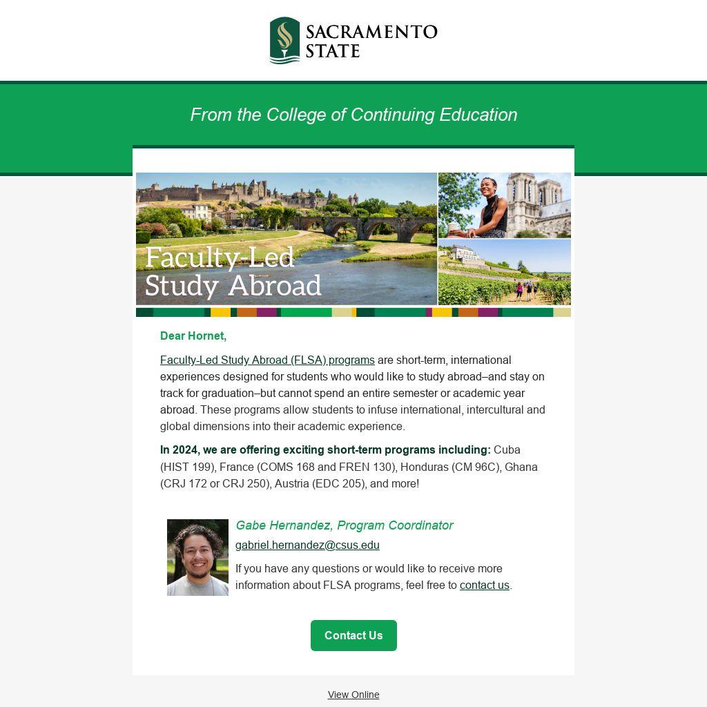 In 2024, we are offering exciting short-term programs including: Cuba (HIST 199), France (COMS 168 and FREN 130), Honduras (CM 96C), Ghana (CRJ 172 or CRJ 250), Austria (EDC 205), and more!