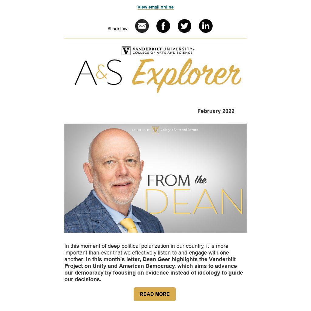 In this moment of deep political polarization in our country, it is more important than ever that we effectively listen to and engage with one another. In this month’s letter, Dean Geer highlights the Vanderbilt Project on Unity and American Democracy, which aims to advance our democracy by focusing on evidence instead of ideology to guide our decisions.