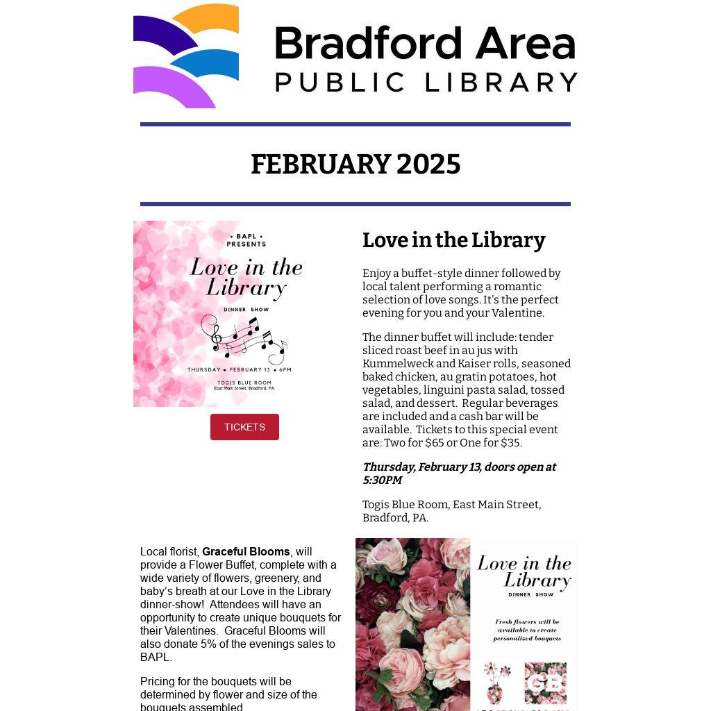 Local florist, Graceful Blooms, will provide a Flower Buffet, complete with a wide variety of flowers, greenery, and baby’s breath at our Love in the Library dinner-show! Attendees will have an opportunity to create unique bouquets for their Valentines. Graceful Blooms will also donate 5% of the evenings sales to BAPL.
