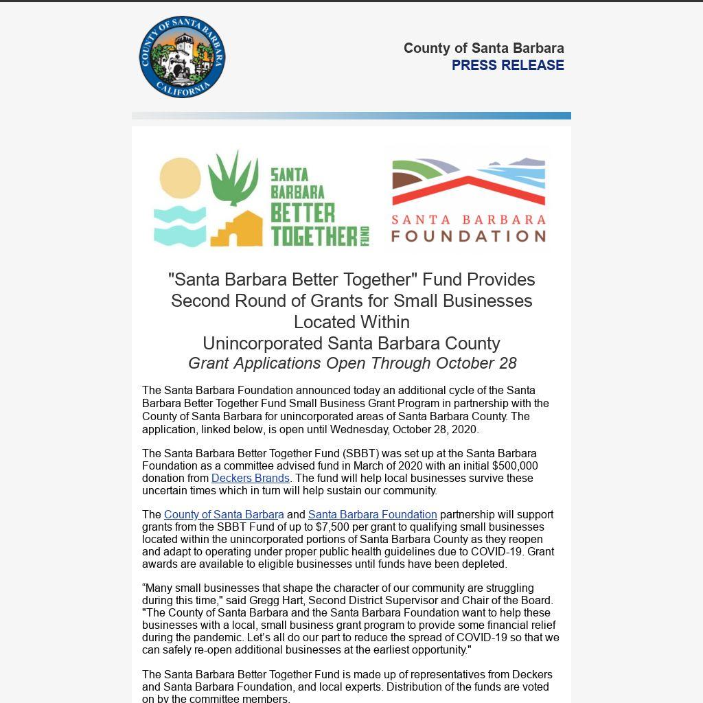 The Santa Barbara Foundation announced today an additional cycle of the Santa Barbara Better Together Fund Small Business Grant Program in partnership with the County of Santa Barbara for unincorporated areas of Santa Barbara County. The application, linked below, is open until Wednesday, October 28, 2020.