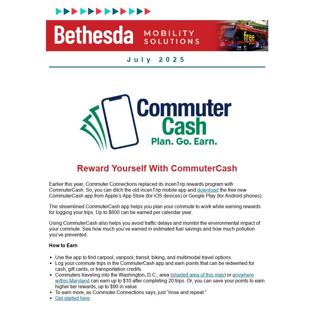 - Log your commute trips in the CommuterCash app and earn points that can be redeemed for cash, gift cards, or transportation credits.