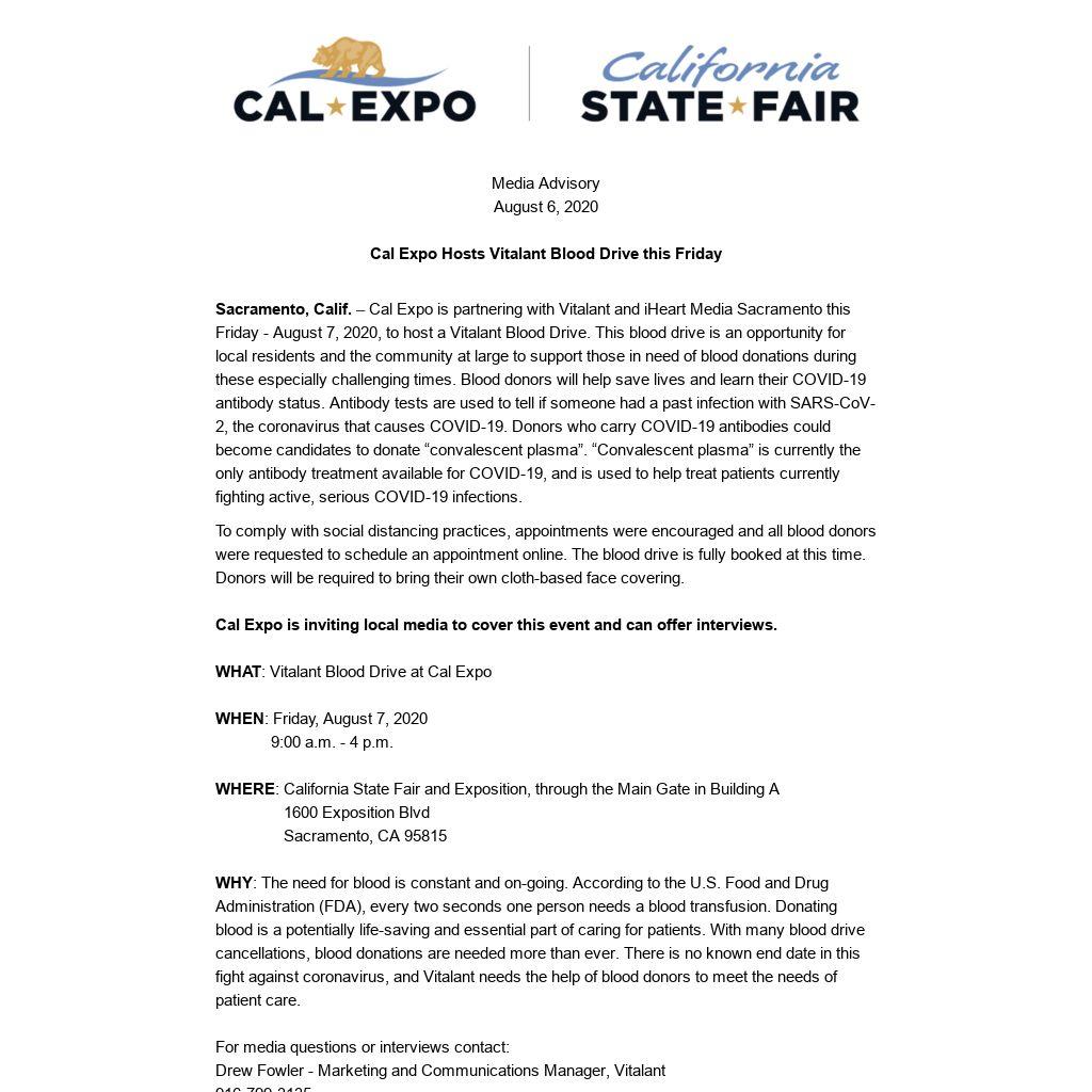 Sacramento, Calif. – Cal Expo is partnering with Vitalant and iHeart Media Sacramento this Friday - August 7, 2020, to host a Vitalant Blood Drive. This blood drive is an opportunity for local residents and the community at large to support those in need of blood donations during these especially challenging times. Blood donors will help save lives and learn their COVID-19 antibody status. Antibody tests are used to tell if someone had a past infection with SARS-CoV-2, the coronavirus that causes COVID-19. Donors who carry COVID-19 antibodies could become candidates to donate “convalescent plasma”. “Convalescent plasma” is currently the only antibody treatment available for COVID-19, and is used to help treat patients currently fighting active, serious COVID-19 infections.