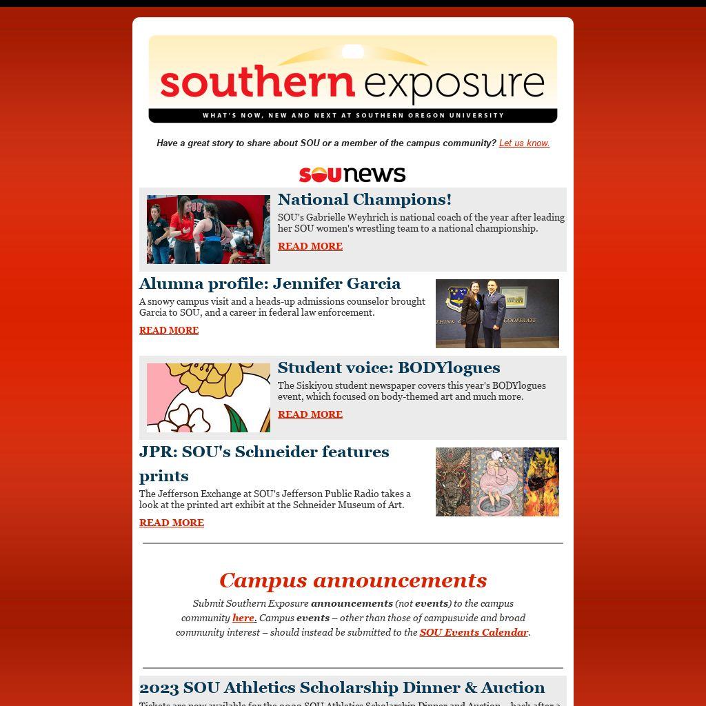 Submit Southern Exposure announcements (not events) to the campus community here. Campus events – other than those of campuswide and broad community interest – should instead be submitted to the SOU Events Calendar.