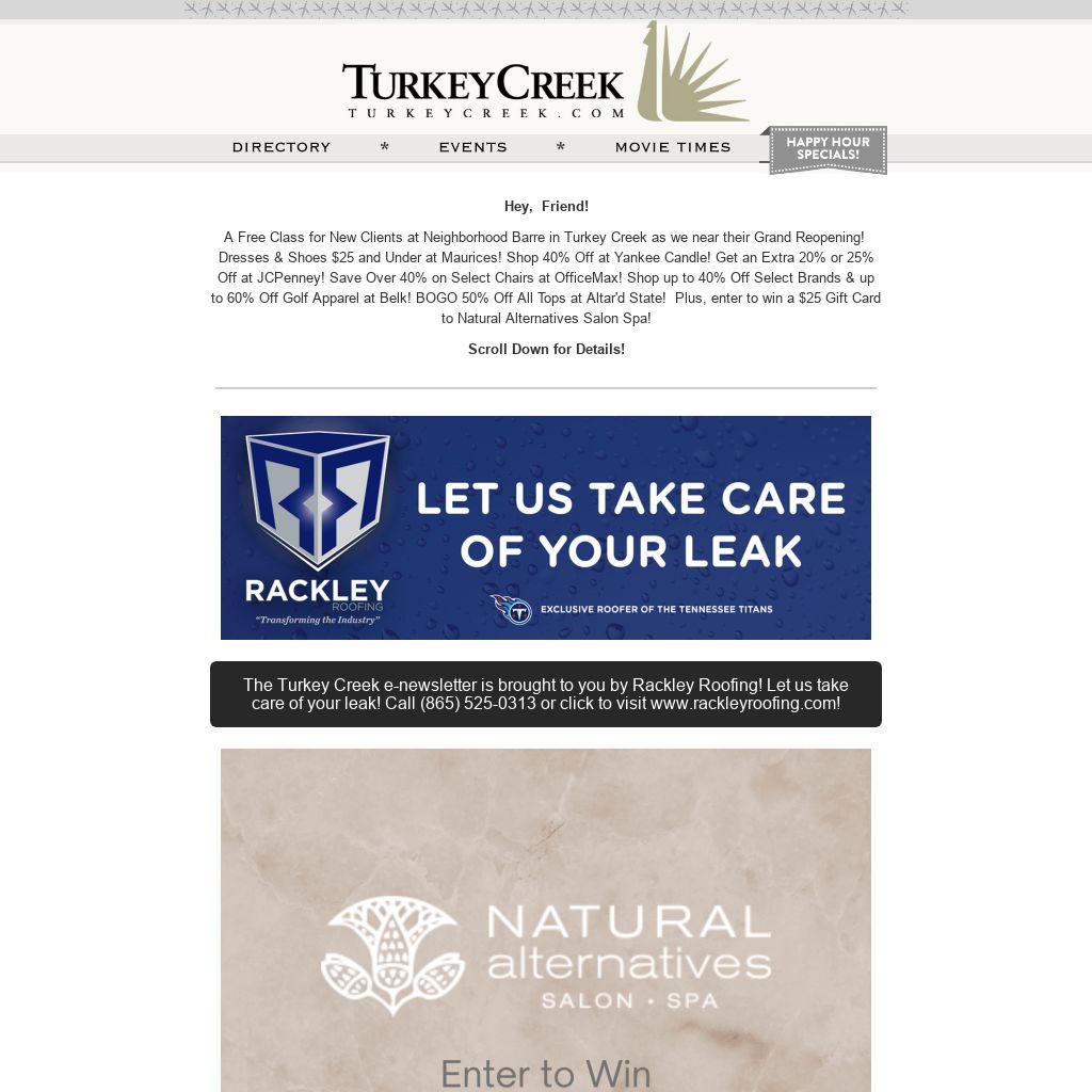 A Free Class for New Clients at Neighborhood Barre in Turkey Creek as we near their Grand Reopening! Dresses & Shoes $25 and Under at Maurices! Shop 40% Off at Yankee Candle! Get an Extra 20% or 25% Off at JCPenney! Save Over 40% on Select Chairs at OfficeMax! Shop up to 40% Off Select Brands & up to 60% Off Golf Apparel at Belk! BOGO 50% Off All Tops at Altar'd State! Plus, enter to win a $25 Gift Card to Natural Alternatives Salon Spa!