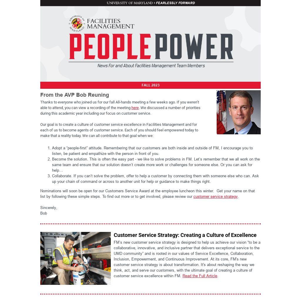 Share your story ideas! People Power is a newsletter for and about FM staff, so let us know if you have suggestions for future editions. Send your ideas and info to fmcommunications@umd.edu.