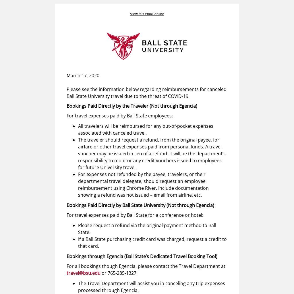Please see the information below regarding reimbursements for canceled Ball State University travel due to the threat of COVID-19.