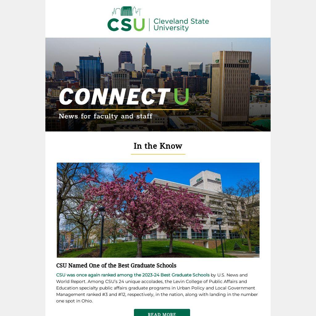 CSU was once again ranked among the 2023-24 Best Graduate Schools by U.S. News and World Report. Among CSU’s 24 unique accolades, the Levin College of Public Affairs and Education specialty public affairs graduate programs in Urban Policy and Local Government Management ranked #3 and #12, respectively, in the nation, along with landing in the number one spot in Ohio.