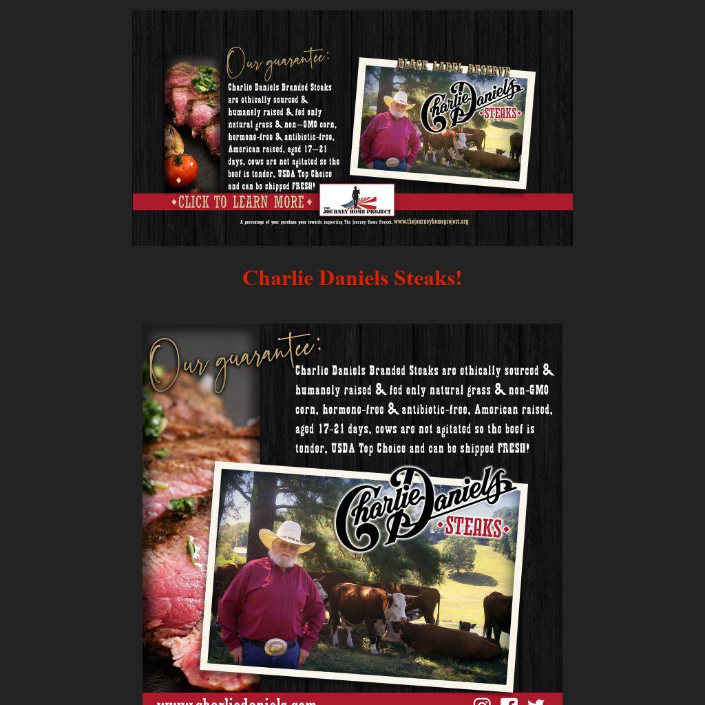 Order amazing ribeye, sirloin and filet steak packages exclusively through CharlieDaniels.com beginning today. They ship frozen, or FRESH! Shipping 9/14. A portion of the profits will benefit Charlie's charity, The Journey Home Project.