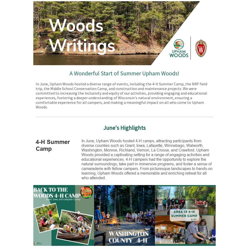 In June, Upham Woods hosted a diverse range of events, including the 4-H Summer Camp, the NRF field trip, the Middle School Conservation Camp, and construction and maintenance projects. We were committed to increasing the inclusivity and equity of our activities, providing engaging and educational experiences, fostering a deeper understanding of Wisconsin's natural environment, ensuring a comfortable experience for all campers, and making a meaningful impact on all who come to Upham Woods.