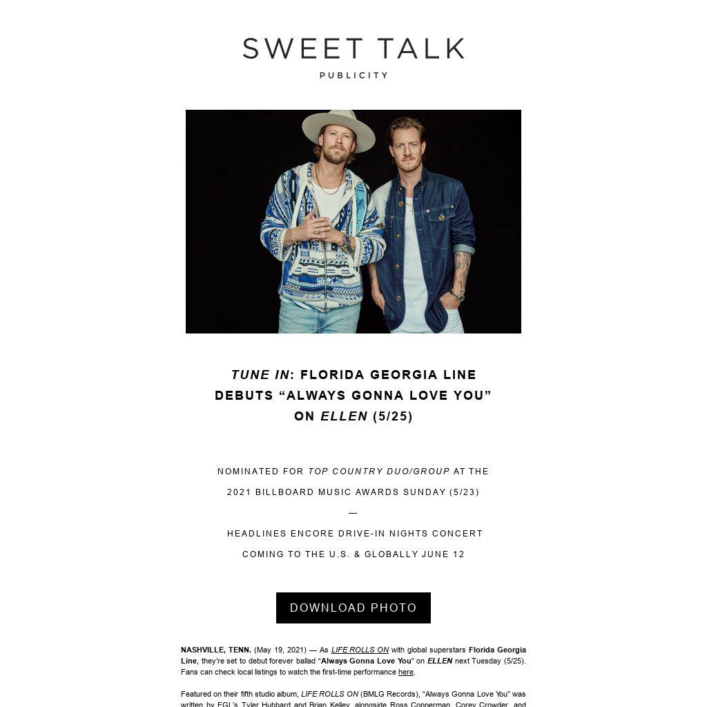 GRAMMY-nominated duo Florida Georgia Line have been making history since 2012. The global superstars are the first and only Country act to achieve two RIAA DIAMOND-certified singles with 11X PLATINUM, #1 breakout “Cruise” (the best-selling digital Country single of all time – SoundScan) and 10X PLATINUM, #1 “Meant to Be” with Bebe Rexha (holding the longest reign on the Billboard Hot Country Songs chart at 50 straight weeks). With their fifth studio album, LIFE ROLLS ON (BMLG Records), featuring #1 hit “Long Live,” FGL keeps proving themselves as in-demand collaborators and “one of the format’s premier musical shapeshifters” (Esquire), including recent releases “Lil Bit” (Nelly), “It’s About Time” (Russell Dickerson), plus “Drinkin' Beer. Talkin' God. Amen.” (Chase Rice). FGL’s tallied 18 career #1 singles, 13.2+ billion global streams, sold more than 40 million tracks and 4.7 million albums worldwide, logged 1.7 billion video views, and played to over 4 million fans spanning massive arena and stadium headline tours. Honored by ACM, AMA, Billboard, CMA, and CMT Music Awards, their creative empire also includes FGL House Party Radio with Florida Georgia Line on Apple Music Country, and thriving business initiatives: FGL House, meet + greet, Round Here Records, Tree Vibez Music, Tribe Kelley, Old Camp Whiskey, and Wolf Moon Bourbon (with Jason Aldean).