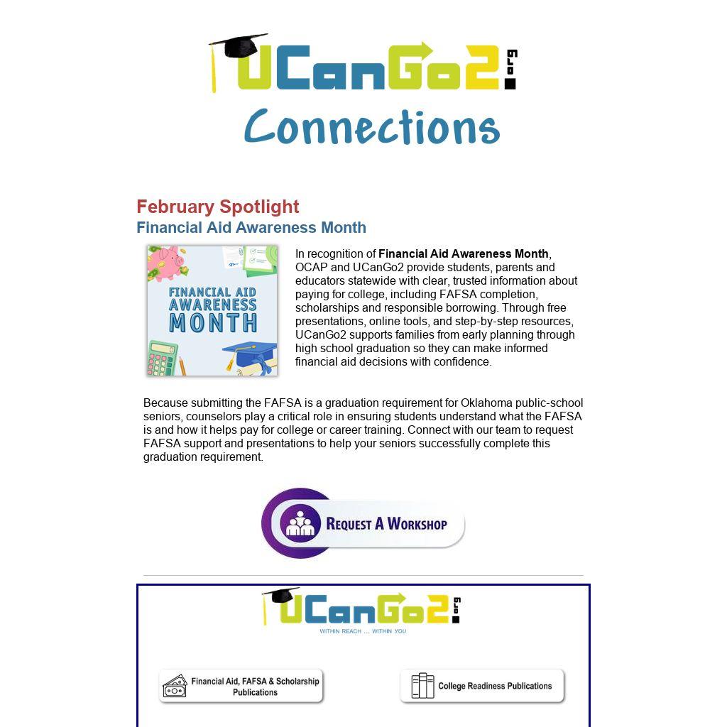 In recognition of Financial Aid Awareness Month, OCAP and UCanGo2 provide students, parents and educators statewide with clear, trusted information about paying for college, including FAFSA completion, scholarships and responsible borrowing. Through free presentations, online tools, and step‑by‑step resources, UCanGo2 supports families from early planning through high school graduation so they can make informed financial aid decisions with confidence.