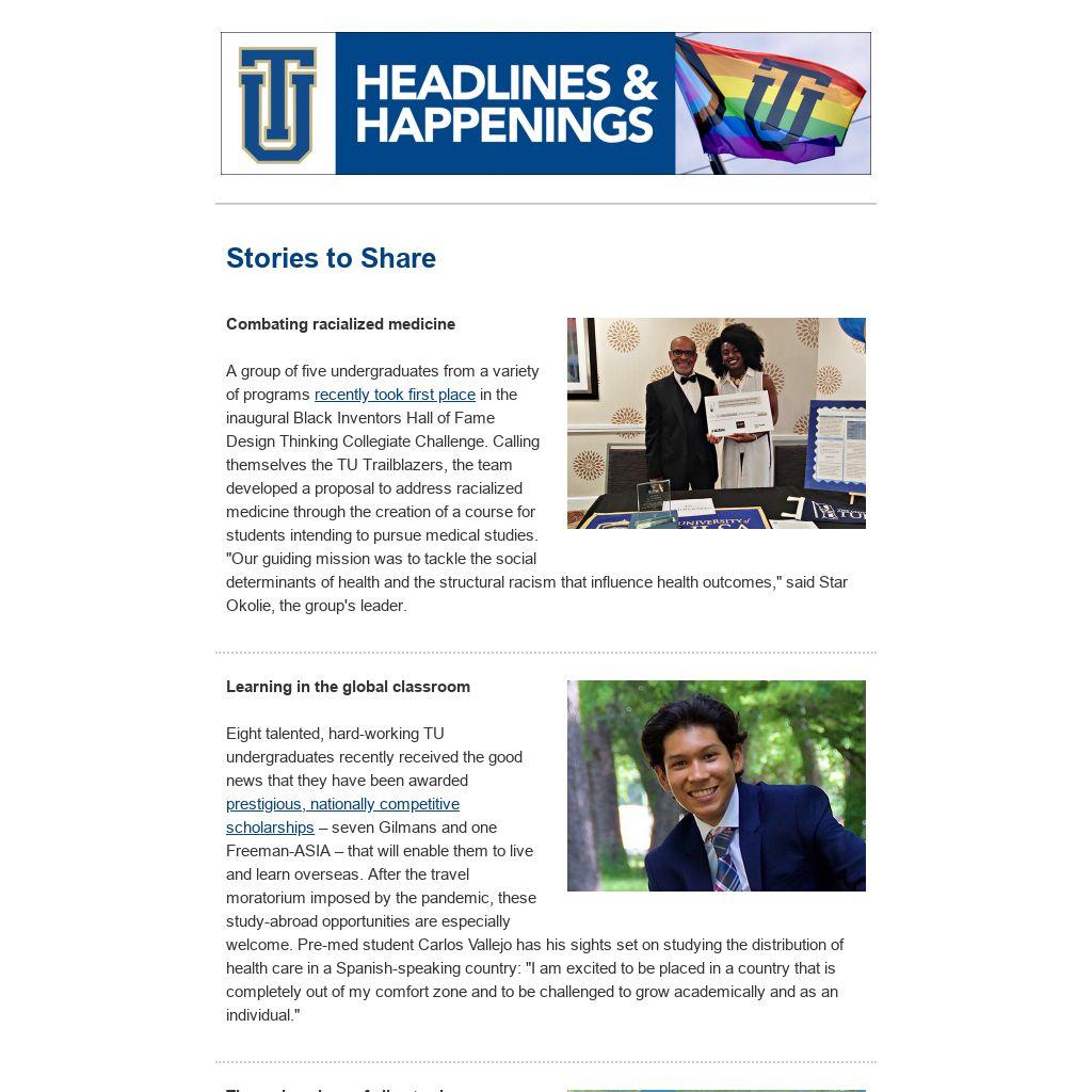 Eight talented, hard-working TU undergraduates recently received the good news that they have been awarded prestigious, nationally competitive scholarships – seven Gilmans and one Freeman-ASIA – that will enable them to live and learn overseas. After the travel moratorium imposed by the pandemic, these study-abroad opportunities are especially welcome. Pre-med student Carlos Vallejo has his sights set on studying the distribution of health care in a Spanish-speaking country: "I am excited to be placed in a country that is completely out of my comfort zone and to be challenged to grow academically and as an individual."