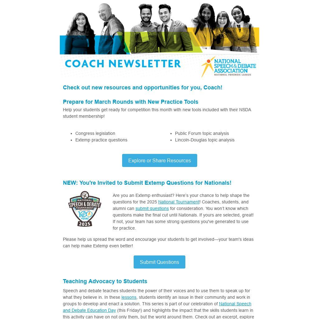 Are you an Extemp enthusiast? Here’s your chance to help shape the questions for the 2025 National Tournament! Coaches, students, and alumni can submit questions for consideration. You won’t know which questions make the final cut until Nationals. If yours are selected, great! If not, your team has some strong questions you've generated to use for practice.