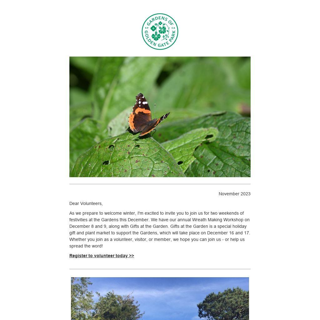 As we prepare to welcome winter, I'm excited to invite you to join us for two weekends of festivities at the Gardens this December. We have our annual Wreath Making Workshop on December 8 and 9, along with Gifts at the Garden. Gifts at the Garden is a special holiday gift and plant market to support the Gardens, which will take place on December 16 and 17. Whether you join as a volunteer, visitor, or member, we hope you can join us - or help us spread the word!