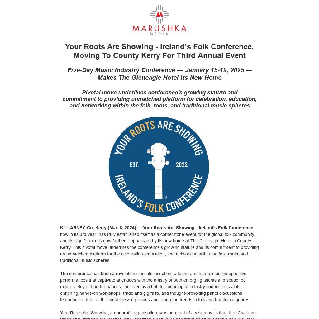 | KILLARNEY, Co. Kerry (Mar. 6, 2024) — Your Roots Are Showing - Ireland's Folk Conference, now in its 3rd year, has truly established itself as a cornerstone event for the global folk community, and its significance is now further emphasized by its new home at The Gleneagle Hotel in County Kerry. This pivotal move underlines the conference's growing stature and its commitment to providing an unmatched platform for the celebration, education, and networking within the folk, roots, and traditional music spheres.