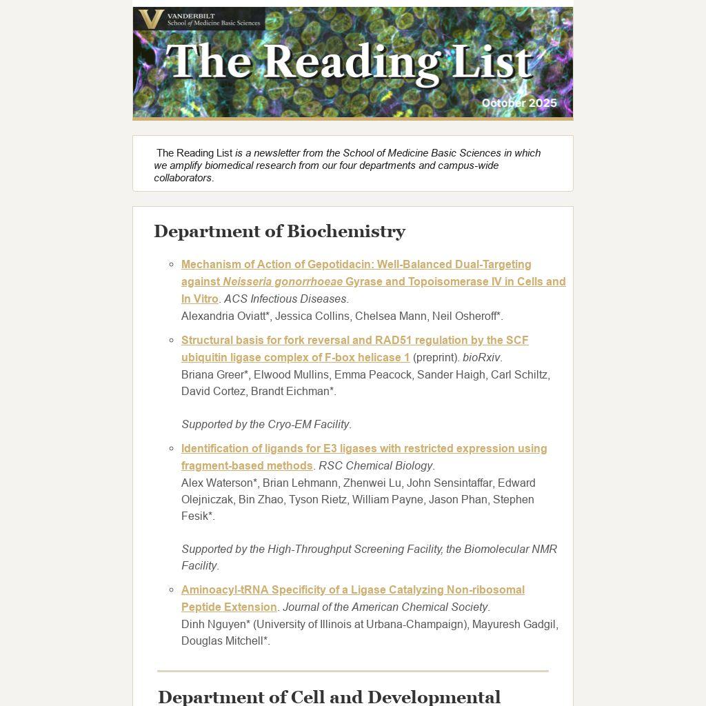 The Reading List is a newsletter from the School of Medicine Basic Sciences in which we amplify biomedical research from our four departments and campus-wide collaborators.