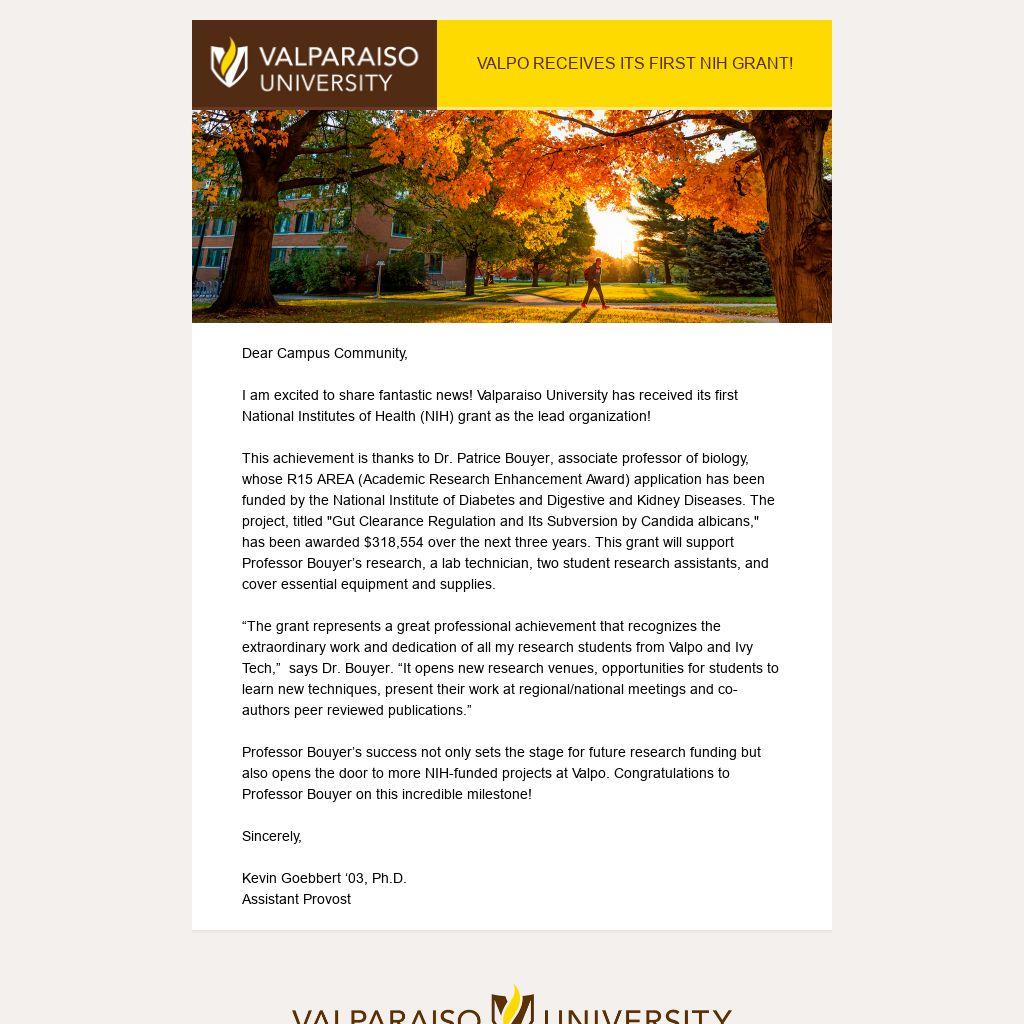 I am excited to share fantastic news! Valparaiso University has received its first National Institutes of Health (NIH) grant as the lead organization!