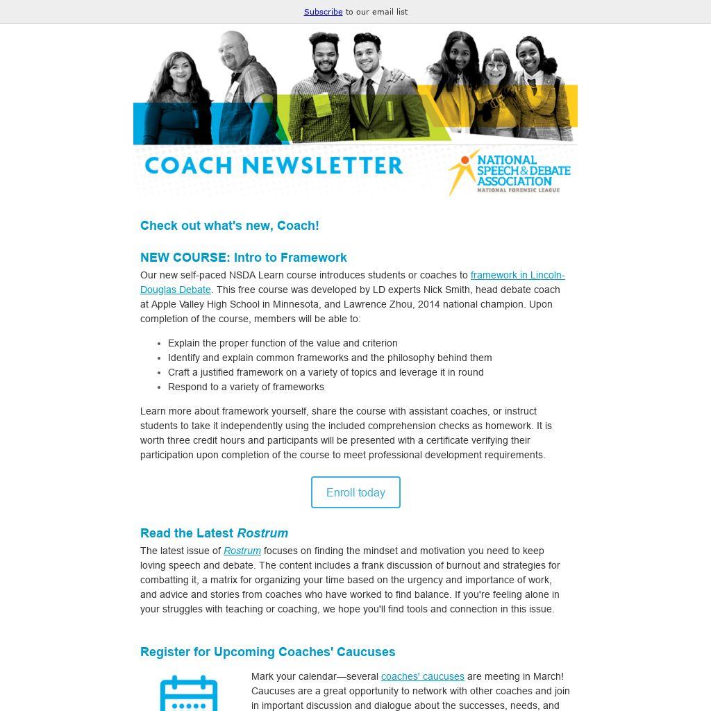 Mark your calendar—several coaches' caucuses are meeting in March! Caucuses are a great opportunity to network with other coaches and join in important discussion and dialogue about the successes, needs, and challenges of communities. Please remember that participants should abide by the NSDA harassment and discrimination policy at all times.