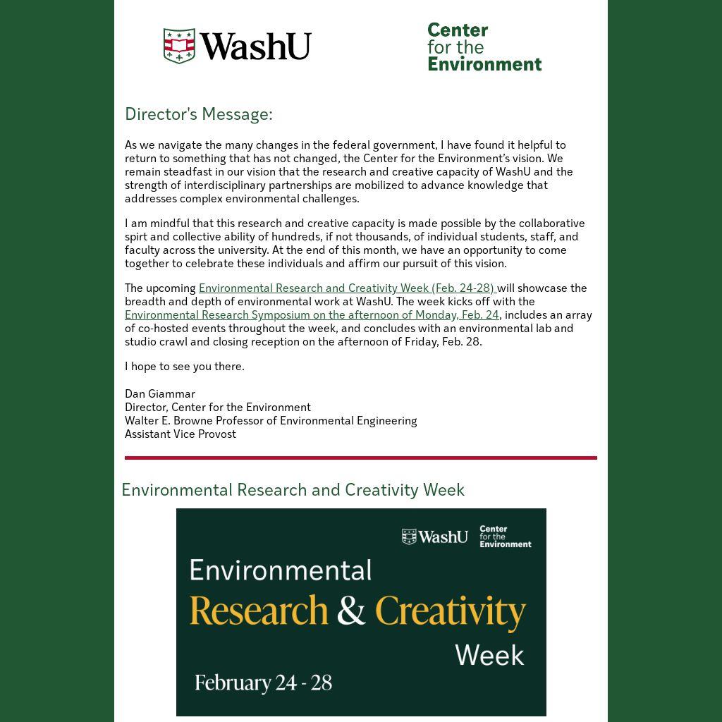Join the Center for the Environment and partners across WashU for Environmental Research & Creativity Week, Feb. 24 - 28. This week celebrates the exciting, diverse environmental work happening throughout the WashU community and foster collaboration among faculty, students, staff, and partners.