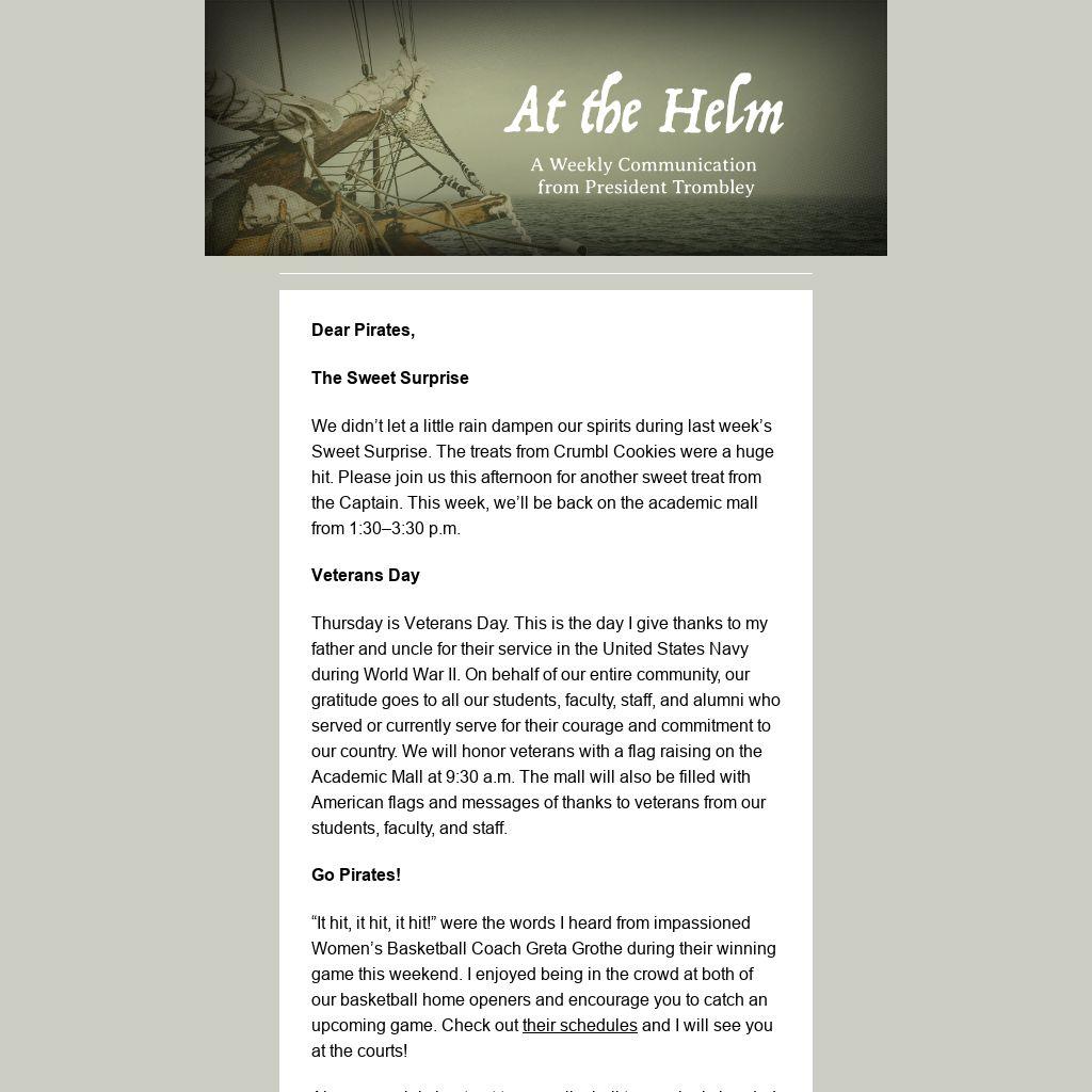 Thursday is Veterans Day. This is the day I give thanks to my father and uncle for their service in the United States Navy during World War II. On behalf of our entire community, our gratitude goes to all our students, faculty, staff, and alumni who served or currently serve for their courage and commitment to our country. We will honor veterans with a flag raising on the Academic Mall at 9:30 a.m. The mall will also be filled with American flags and messages of thanks to veterans from our students, faculty, and staff.